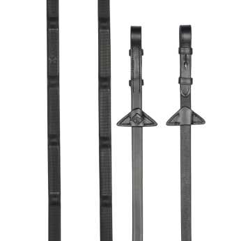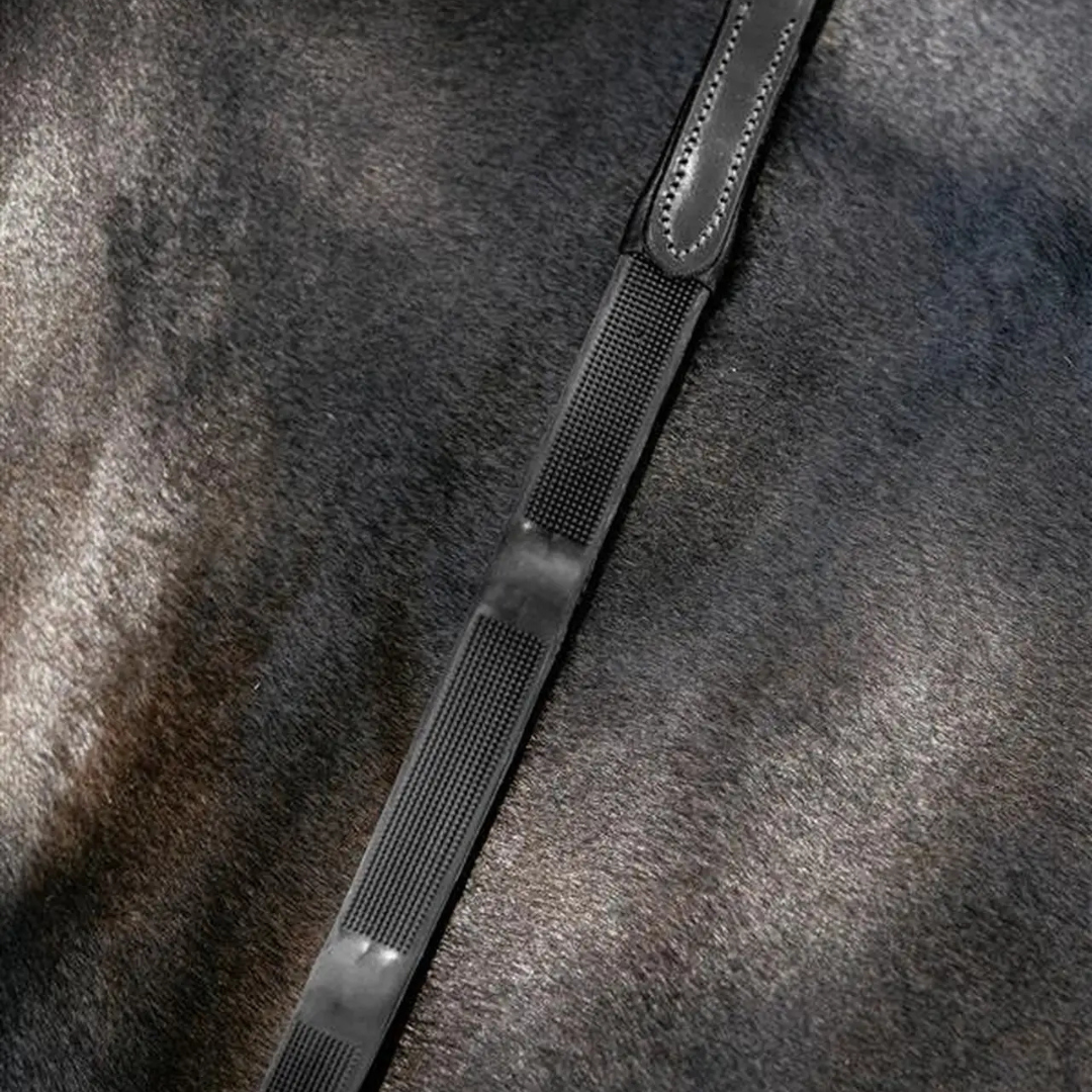 These premium quality low profile rubber reins have integrated raised rubber stoppers for ultimate traction. Fine textured grippers run between the stoppers for added grip (15mm Kris polymer rubber).