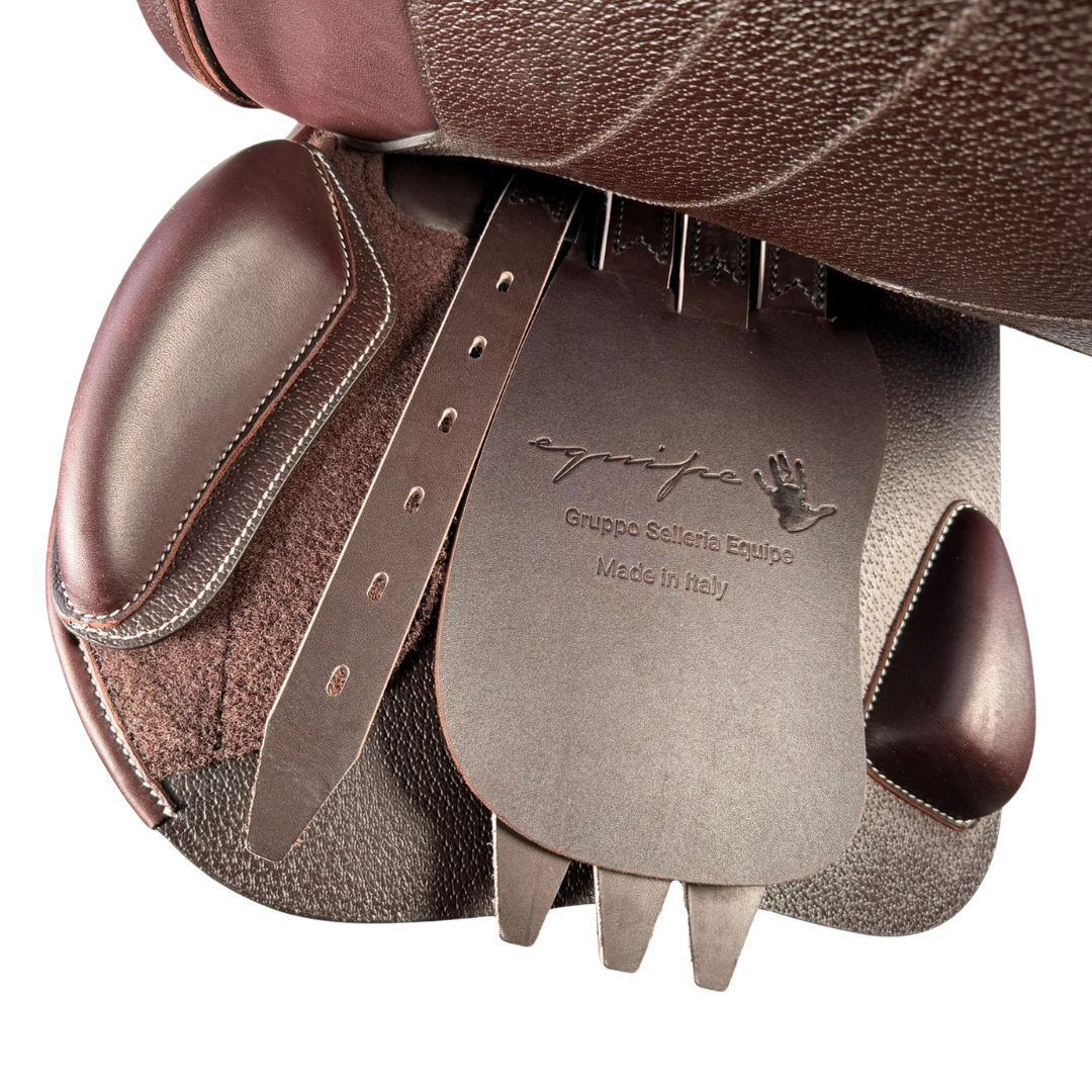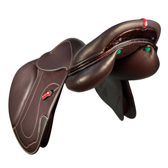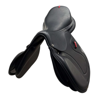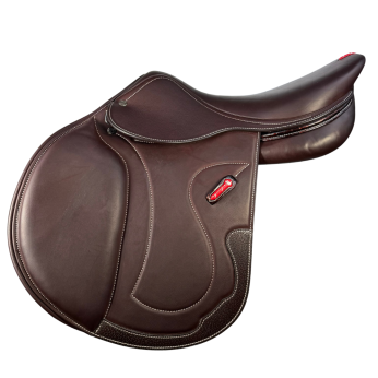 Jumping saddle with a narrow twist, front blocks and ergonomic panels. Enhances precision, comfort and close contact with the horse.